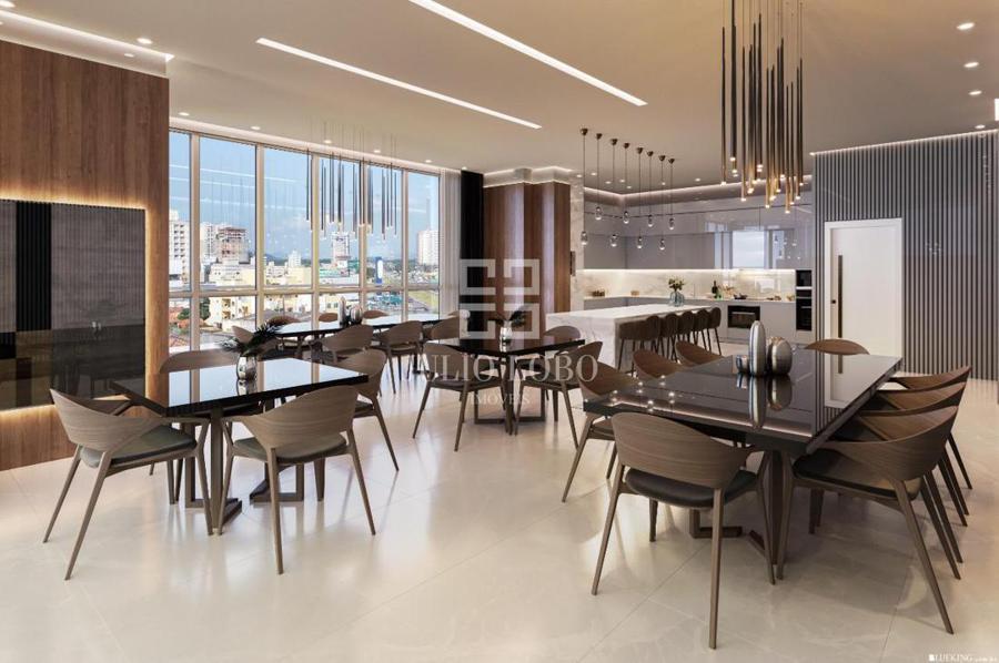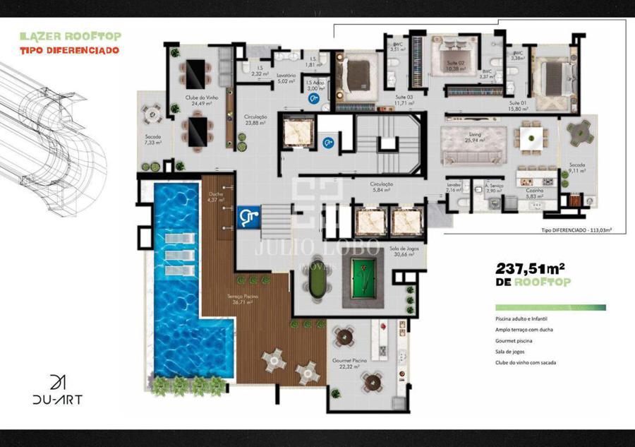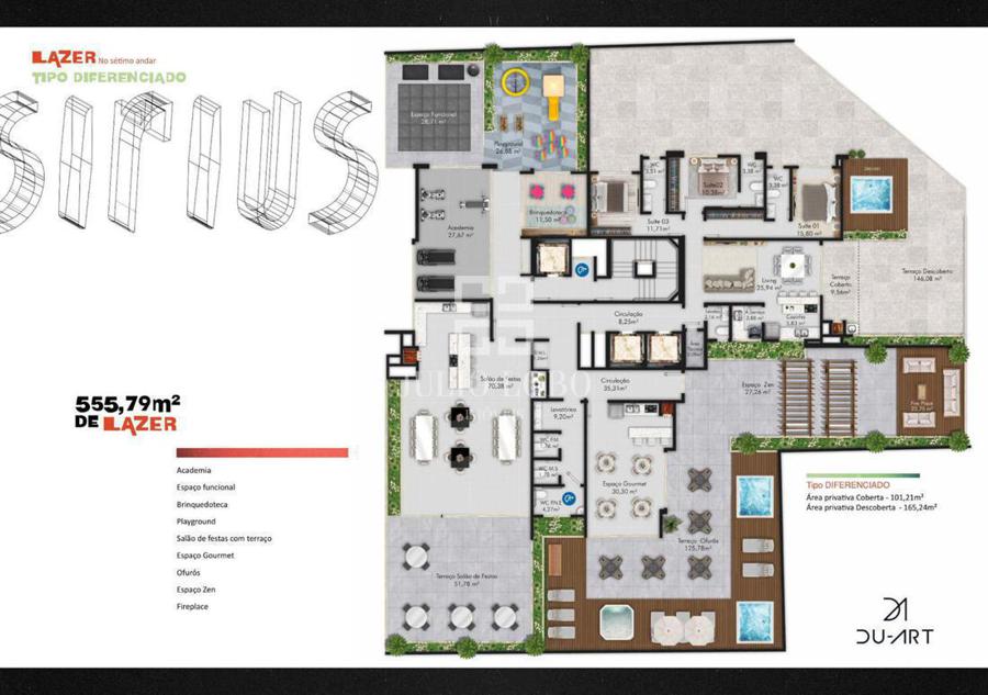 Dividida em 2 áreas, sendo uma no Rooftop e outra no 7º pavimento. Entregue mobiliada, decorada e equipada c/ aproximados 790m².